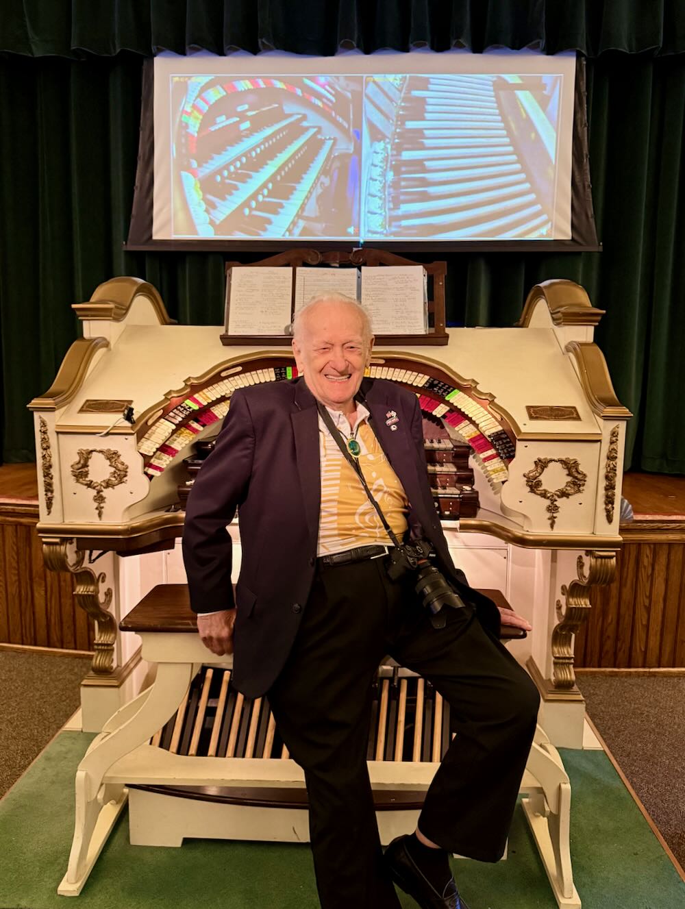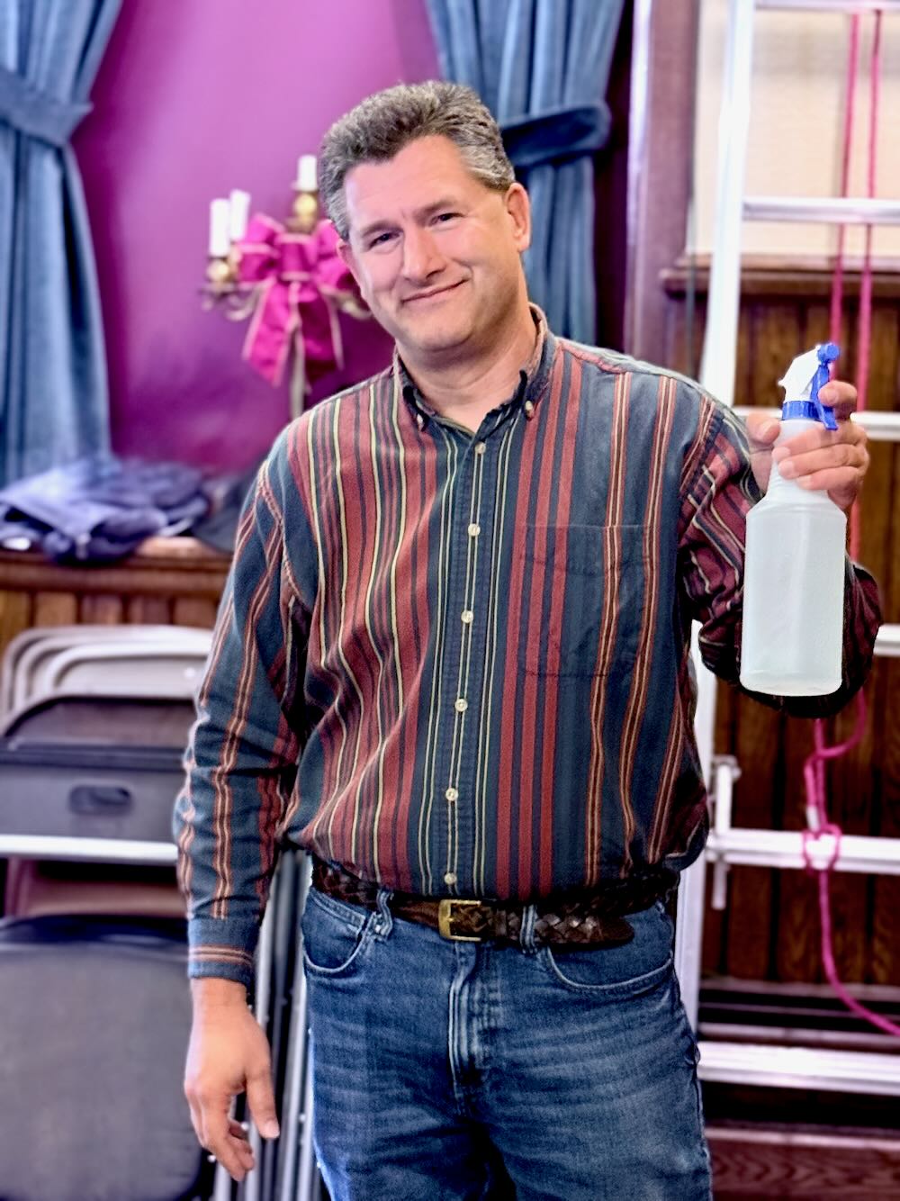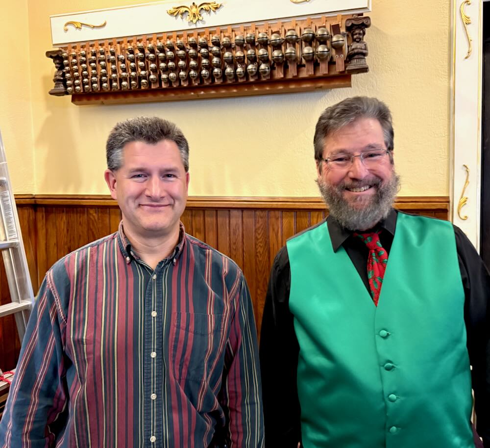 But dry, frigid weather has its costs on theatre organs – happiest in warmer, humid weather.  To the rescue with his misting bottle and humidifying interventions, ARCA’s invaluable organ technician Jason Wiles saved the day – climbing up the ladder to the infuse the blower behind the percussion shelf with much needed moisture!
