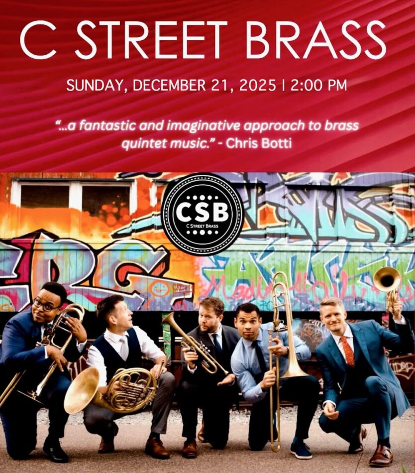 Let the Spectacular Trumpets Sound – in this festive ‘ultimate’ in Christmas brass entertainment, as C Street Brass comes off of a nation-wide tour and returns to Lincoln Hall on Sunday, December 21 at 2 PM with flare, theatricality, and consummate virtuosity in their delightful and imaginative something-for-everyone program of holiday music spanning centuries, genres, and styles. Joy to the World!