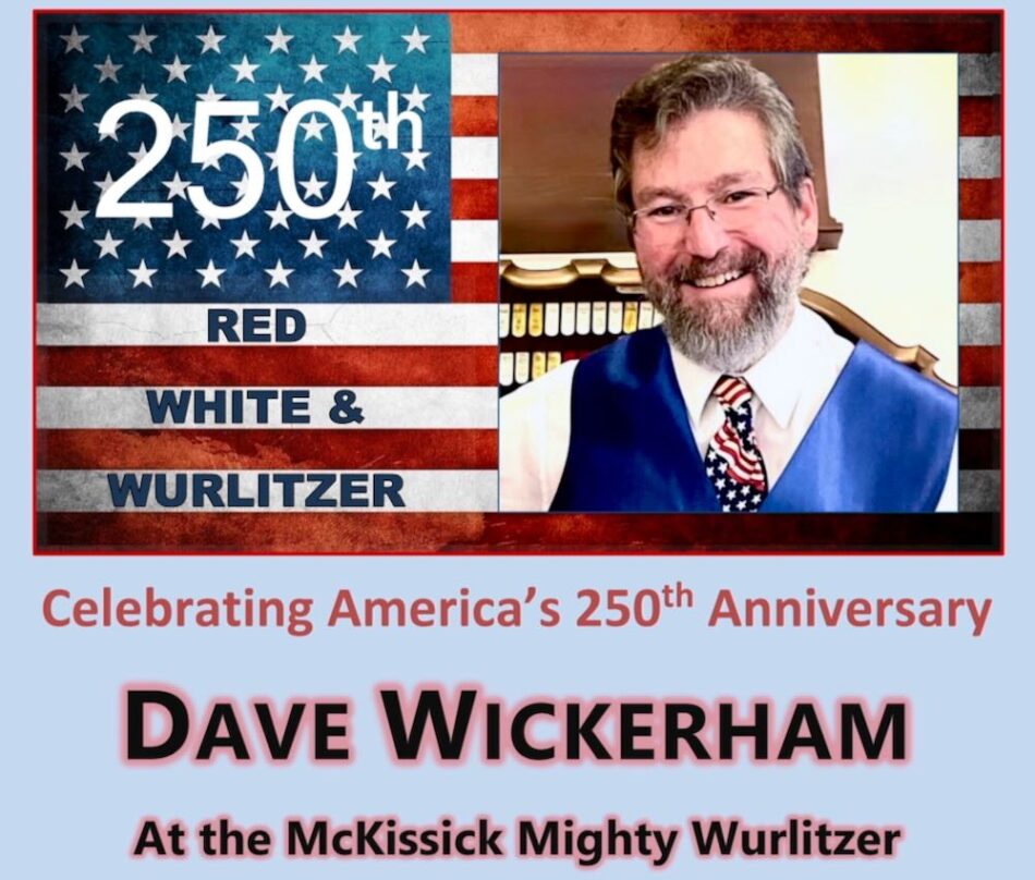 World-travelled theatre organist DAVE WICKERHAM will perform arrangements from the Great American Song Book, hymns, marches, an Armed Forces salute and Stars and Stripes Forever on the newly restored McKissick Mighty Wurlitzer. He will be joined by Metropolitan Opera bass-baritone WILLIAM POWERS in medleys of George M. Cohan and Glenn Miller, the Battle Hymn of the Republic and more!