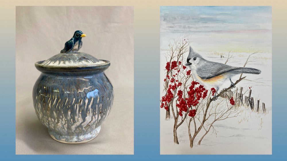 Two artists express their respect and concern for nature, especially wildlife, using vivid color and carefully depicted forms within their respective media.