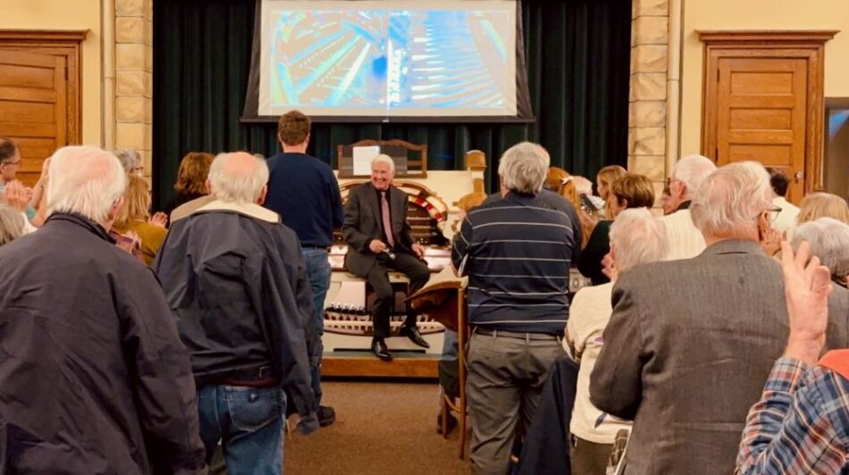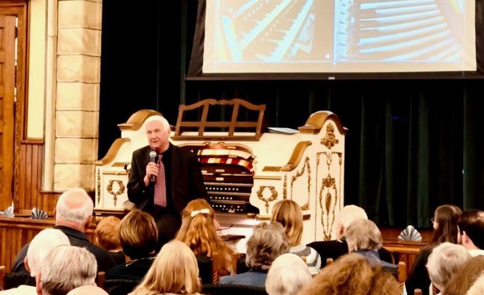 The richly varied concert program Jonas performed on the newly restored McKissick Mighty Wurlitzer ranged from “Mama Mia”, “The Way We We Were”, and a 50’s medley to “Fireside Fancies” by Joseph Waddell Clokey and ending the first half with his singularly famous arrangement of “Pinball Wizard” which utilized to the max the percussion battery on hall’s visible percussion shelf.