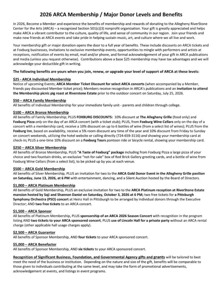 Partner with us – as we help ARCA transition from a founder/volunteer organization to one with a deeply girded foundation, ensuring that music and art will continue to touch the lives of young and old and enrich the quality of life in our the greater Allegheny River region for many years to come. Together we can make it happen.